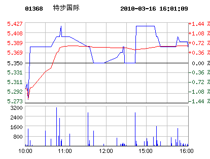 | 特步國際代碼:01368.hk | 5.390.04 0.75%2010-03-16 16:01:09 | 昨收:5.35 今開:5.30 成交:28780最高:5.42 最低:5.28 均價:5.39流通:21.74億 市值:117.16億 換手:0.00% |