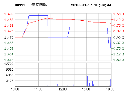 昨收:1.47 今開:1.46 成交:49,640 最高:1.49 最低:1.46 均價:1.47 流通:10.38億 市值:15.25億 換手:0.00% |