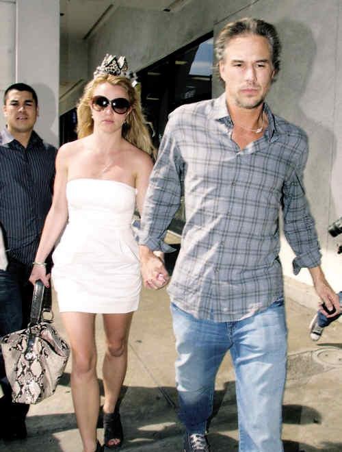 布蘭妮身穿白色低胸短裙,頭頂豹紋皇冠、腳踏魚嘴鞋與男友牽手親昵逛街