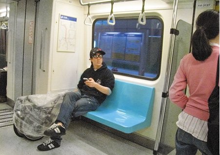 房祖名一身休閑鞋服帶折疊車(chē)坐捷運(yùn)