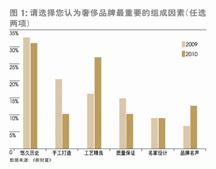 2010年度《新財富》“資本圈最推崇的奢侈品牌排行榜”上,最大的變化并不是不同類別品牌座次的變動,而在于奢侈品牌內涵最重要的組成要素中,處于第三位的“質量保證”一項被“品牌名聲”所取代—選擇后者的資本圈人士比上年增加了6個百分點,從候選的六大要素中的墊底位置一躍而上,而悠久歷史和工藝精良依然穩坐頭兩把交椅(圖1)。