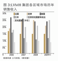 兩廂作用之下,奢侈品牌一邊加緊完善在中國的網點布局,一邊調整營銷策略。范思哲于2009年10月撤離日本市場,計劃投資5600萬美元重新布局亞洲市場,把重心轉移至中國。2009年12月底,LV在中國市場的第24家門店在長沙開張,與在19個城市擁有28家門店的Gucci一樣,全部為集團直接掌控的直營店。LVMH集團的財報顯示,2000-2009上半年,最明顯的兩個趨勢就是日本市場的逐漸隕落以及由中國領銜的亞洲其他國家和地區的崛起。2009年上半年,只有除日本以外的亞洲國家和地區實現了店鋪數量與對集團收入貢獻的雙重增長,其中,絕大部分的貢獻顯然來自中國(圖3、4)。如果從服飾皮具類商品的收入區域分布來看,這一趨勢更加明顯(圖5)。