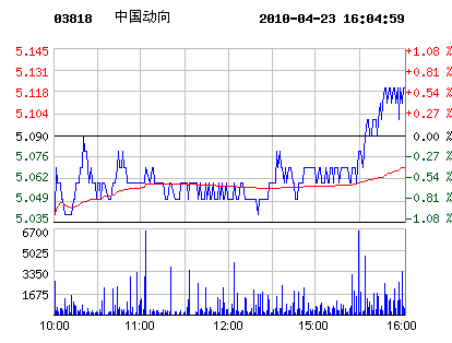 | 中國動向代碼:03818.hk | 5.130.04 0.79%2010-04-23 16:07:02 | 昨收:5.09 今開:5.04 成交:188,400最高:5.14 最低:5.04 均價:5.07流通:56.66億 市值:290.69億 換手:0.00% |