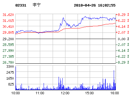 | 李寧代碼:02331.hk | 31.151.95 6.68%2010-04-26 16:02:55 | 昨收:29.20 今開:29.65 成交:73149最高:31.40 最低:29.65 均價:30.70流通:10.49億 市值:326.76億 換手:0.01% |