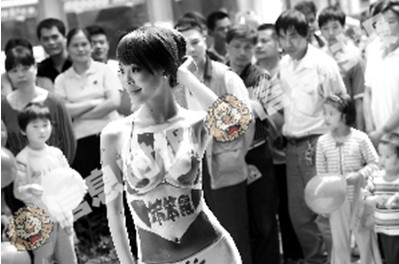 圖為娜娜人體彩繪參加專店促銷現(xiàn)場
