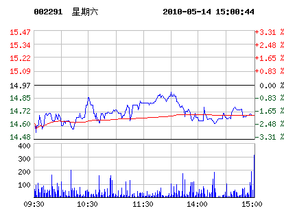 | 星期六 代碼:002291.sz | 14.680.29 1.94%2010-05-14 15:00:44 | 昨收:14.97 今開:14.60 成交:8,643最高:14.90 最低:14.52 均價:14.68 市盈率:68.03流通:0.71億 市值:41.03億元 換手:1.21% |