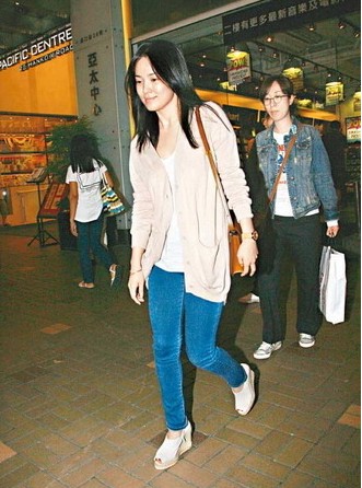 宋慧喬著米色休閑外套搭配白色魚嘴鞋外出掃貨