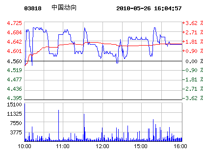 | 中國動向代碼:03818.hk | 4.760.20 4.39%2010-05-26 16:14:51 | 昨收:4.56 今開:4.45 成交:571,260最高:4.79 最低:4.45 均價:4.67流通:56.66億 市值:269.72億 換手:0.01% |