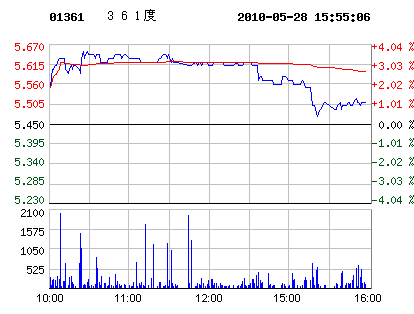 | 361度代碼:01361.hk | 5.490.04 0.73%2010-05-28 15:58:33 | 昨收:5.45 今開:5.55 成交:36,770最高:5.65 最低:5.45 均價:5.59流通:20.65億 市值:113.39億 換手:0.00% |