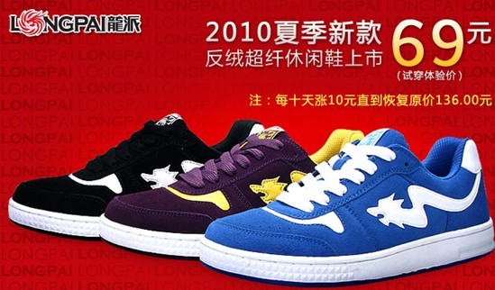 中國(guó)鞋網(wǎng)6月7日訊,中國(guó)民族商務(wù)休閑第一品牌“龍派”2010夏季新款產(chǎn)品在拍鞋網(wǎng)商城上架,此次上架的“龍派”休閑鞋新品有深紫/黃、寶藍(lán)/白和黑/白三種款式。