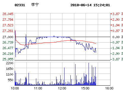 | 李寧代碼:02331.hk | 26.350.65 2.41%2010-06-14 15:26:39 | 昨收:27.00 今開:27.30 成交:56,055最高:27.30 最低:26.05 均價:26.66流通:10.50億 市值:276.75億 換手:0.01% |