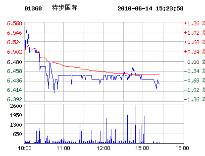 | 特步國際代碼:01368.hk | 6.430.05 0.77%2010-06-14 15:23:57 | 昨收:6.48 今開:6.50 成交:39,495最高:6.55 最低:6.40 均價:6.45流通:21.74億 市值:139.81億 換手:0.00% |
