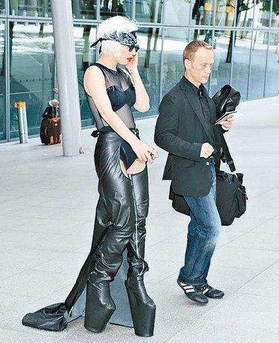 昨日GaGa由美國飛抵英國,在步出倫敦希斯路機場時,身穿透視裝及超高Platform底高跟鞋的她不慎摔倒,當眾出丑,要由助手扶起。