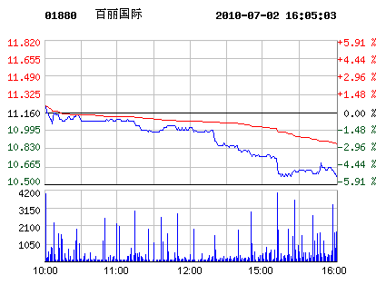 | 百麗國際代碼:01880.hk | 10.620.54 4.84%2010-07-02 16:09:00 | 昨收:11.16 今開:11.22 成交:134,642最高:11.22 最低:10.56 均價:10.84流通:84.34億 市值:895.72億 換手:0.00% |