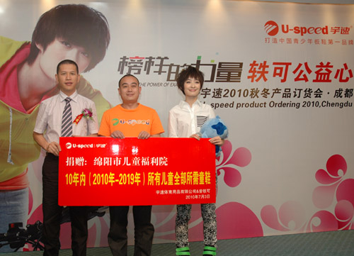 中國鞋網7月4日訊,宇速童鞋2010秋冬季產品訂貨會今(3)日在蓉舉行,"快女"人氣偶像曾軼可首次以宇速品牌代言人的身份亮相。訂貨會上,宇速體育用品公司總經理魏劍明與曾軼可共同啟動了"軼可公益心"活動,聯合向綿陽市兒童福利院捐贈了價值40萬元的宇速童鞋。