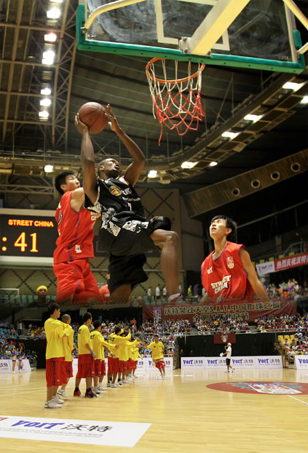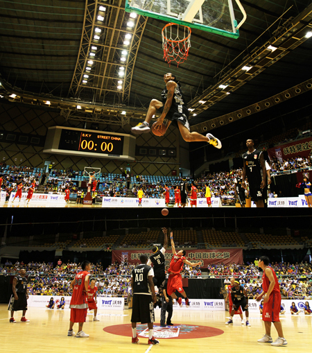 比賽一開始,本土作戰的STREET CHINA就表現出飽滿的斗志,TS首先以一個漂亮的突破反手上籃先得兩分。不過,沒有料到的是,在這兩分之后,便開始進入了S.K.Y.時間,BIG SWOAL的空中接力、HELICOPTER直升機般的垂直暴扣、AO魔術般的運球過人引得現場觀眾驚叫連連,直到比分在21比2的時候,STREET CHINA才開始有所起色,通過罰球和快攻上籃將比分拉近。但是,昨天S.K.Y.并沒有準備給STREET CHINA機會,他們用禁閉盯人遏制了STREET CHINA的進攻,并且用犀利的反擊在第二節就將中國球員們徹底擊倒,下半場便進入了所謂的“垃圾時間”。