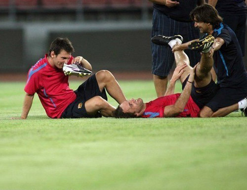 中國鞋網8月6日訊,西甲巴塞羅那俱樂部球員在北京工人體育場進行首次公開訓練,梅西和其它隊員聞起了臭鞋,自娛自樂。