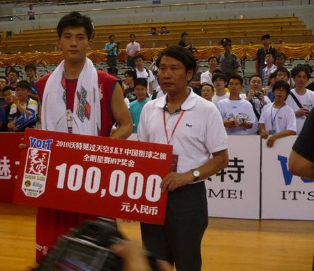 終場(chǎng)哨響,STREET CHINA的球員們抱作一團(tuán),一個(gè)多月下來,8位球員之前早就產(chǎn)生了兄弟情誼,但是今晚會(huì)在他們中間產(chǎn)生一名MVP球員,評(píng)審團(tuán)在本場(chǎng)表現(xiàn)出色的褚文浩、HOT DOG以及三場(chǎng)比賽均有穩(wěn)定表現(xiàn)的BILLY三人中間產(chǎn)生了分歧,最后還是一致通過,“上海小子”褚文浩成為了第一屆沃特晃過天空中國街球之旅的MVP球員,賽事贊助商沃特集團(tuán)董事長、總裁蔡金輝先生為他頒上了MVP獎(jiǎng)杯以及10萬元現(xiàn)金大獎(jiǎng)的支票。褚文浩表示,今年隊(duì)友們都表現(xiàn)得非常出色,這個(gè)MVP獎(jiǎng)杯應(yīng)該是屬于大家的,明年他一定還會(huì)來參加晃過天空的比賽。