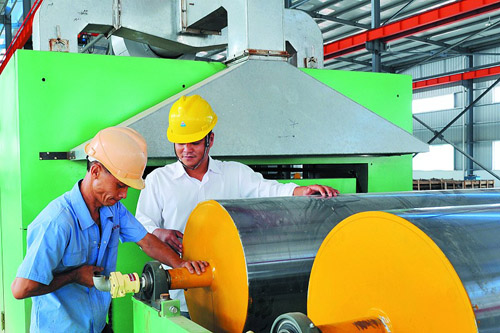 中國鞋網9月3日訊,三明市重點項目建設戰役之一的尤溪合成革集中區,占地500多畝。今年來借力海西建設,承接溫州產業轉移,引進6家合成革項目,總投資10.5億元,年可消化當地紡織企業革基布產品2億米,成為“中國革基布名城”、尤溪縣紡織產業鏈延伸的“火車頭”!拔宕髴鹨邸贝蝽懸詠恚@里處處呈現“大干150天”的火熱景象,已完成投資3. 5億元,10月后將陸續試生產。圖為8月31日,總投資1.5億元的福建永強合成革有限公司干法生產線的設備安裝場景。