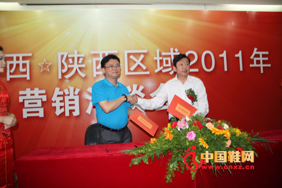 中國鞋網9月6日訊,9月4日下午,CBA運動裝備山西.陜西區域2011年營銷洽談會在西安曲江國際會展中心隆重召開。會上,CBA品牌運營商國輝(中國)有限公司向陜西省體育局捐贈籃球基礎建設設備;雙方簽署了戰略合作意向協議。據悉,上午國家體育總局常務副局長段世杰,陜西省體育局局長王建軍,也親臨會展中心B4館CBA品牌展示廳參觀指導。