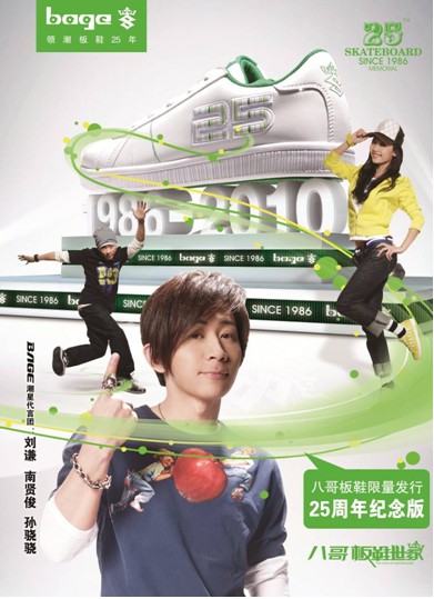 八哥(中國)有限公司創立于1986年,同年,自主研發創造了中國第一雙板鞋,素有“板鞋世家”的美譽。隨著國門的越來越開放,國際時尚潮流的影響力越來越大。追求個性、獨立、有思想、追求酷、彰顯個人本色、追求自我,喜歡標新立異的扮酷,喜歡刺激和挑戰成為當今年輕一代的主流。八哥CEO丁俊賢先生認識到板鞋是當今年輕一代的主流穿著,板鞋時代即將來臨,提出了“中國板鞋第一品牌”的戰略布局。2010年,BAGE(八哥)品牌為慶祝成立25周年,隆重推出了“25周年紀念板鞋”,此主題板鞋的推出,不僅能豐富BAGE(八哥)的產品結構,制造銷售熱點,同時也可以弘揚BAGE(八哥)板鞋文化和深厚的歷史背景。此主題板鞋采用輕盈的材質和流暢的外形,用簡約來意蘊銳利,鞋身凸印“25”字樣,向世人闡述BAGE(八哥)領潮板鞋25年的輝煌榮耀。