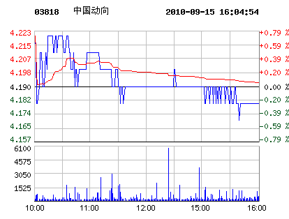 | 中國動向代碼:03818.hk | 4.190.00 0.00%2010-09-15 16:09:30 | 昨收:4.19 今開:4.22 成交:82962最高:4.22 最低:4.17 均價:4.19流通:56.66億 市值:237.42億 換手:0.00% |
