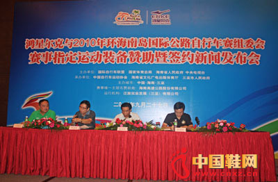 中國鞋網10月5日訊,日前,2010年環海南島國際公路自行車賽新聞發布會在海口舉行,賽事組委會攜手贊助商、知名服飾品牌鴻星爾克熱情亮相環島賽簽約新聞發布會,積極傳播低碳生活理念。發布會上,鴻星爾克展示了為環島賽5周年傾情設計的主題服裝,并宣布即日啟動第二屆“鴻星爾克杯”環島賽攝影大賽等系列活動。