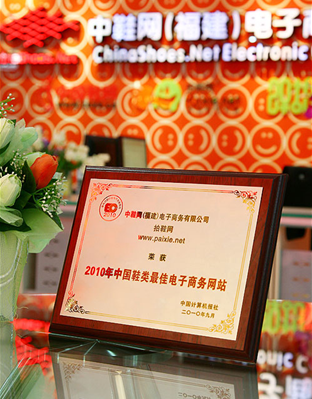 中國計算機報和賽迪傳媒于2010年聯合舉辦的“2010年最具價值行業電子商務網站”評選活動中,經過專業評審團3個月的綜合測評,中鞋網(福建)電子商務有限公司旗下的B2C平臺拍鞋網最終獲得“2010年中國鞋類最佳電子商務網站”榮譽稱號。