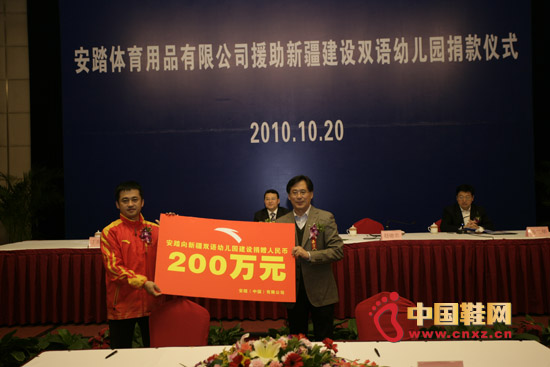 簽約儀式上,新疆維吾爾自治區黨委常委爾肯江•吐拉洪代表新疆教育廳親自從安踏體育用品有限公司董事局主席兼首席執行官丁世忠先生手中接過了200萬元善款。四所雙語幼兒園的建設,為新疆地區實現全面雙語教育更添一把薪火。爾肯江•吐拉洪稱:推進“雙語”教育事業的發展,是實現新疆跨越式發展和長治久安、改善民生、凝聚民心、促進民族團結和社會公平的重要舉措;我們由衷的感謝安踏對我們的支持,感謝福建人民對新疆教育事業的關懷與支持。