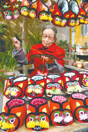 【中國鞋網】 11月7日,山東省臨沂市郯城縣民間藝人賈現英在趕制虎頭棉鞋。