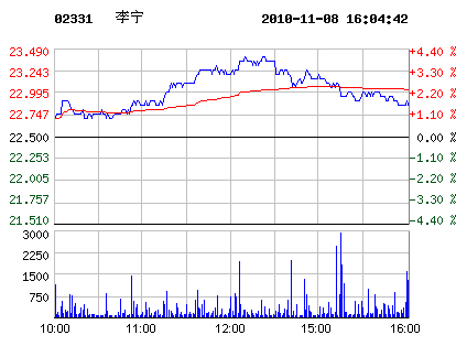| 李寧代碼:02331.hk | 23.000.50 2.22%2010-11-08 16:13:03 | 昨收:22.50 今開:22.70 成交:75651最高:23.40 最低:22.70 均價:23.03流通:10.51億 市值:241.81億 換手:0.01% |