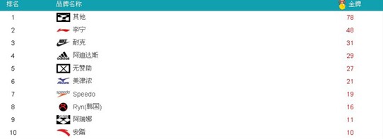 廣州亞運會進入到第10個比賽日,田徑項目一登場,耐克必將成為最具有競爭力的體育品牌,今日耐克狂攬7枚金牌,而田徑項目就貢獻了4金,可謂“田徑一出手,就知有沒有”,單日7金戰績也是自亞運會開賽以來的最高紀錄。而作為“民族品牌”的李寧,因為有強大的中國代表團的支撐,一如往常有著穩定的發揮,蹦床、跳水助其居高不下。此外,“多點開花”的阿迪達斯單日攬3金表現亦不俗。