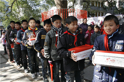 這天,埭頭小學的百余名學生每人收到了一份新年禮物——紅蜻蜓集團送來的精品童鞋。通過共青團永嘉縣委的牽線搭橋,紅蜻蜓集團團委和紅蜻蜓兒童用品公司聯合啟動了“溫暖童行關愛山區兒童公益活動。在一個月內,紅蜻蜓“溫暖童行”活動還將陸續走進永嘉縣多個山區和小學,為當地的600余名留守兒童送去冬天保暖的衣服和鞋子。