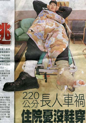 現年40歲的張金國,家住臺灣新北市,是一名保安。他從15歲起身高迅速增長,現在身高220厘米,體重180公斤,被譽為“臺灣第一高人”。傲人的身高同時給他帶來了一雙超乎常人的大腳,市面上根本買不到合適的鞋子,這給張金國帶來了無盡的煩惱。