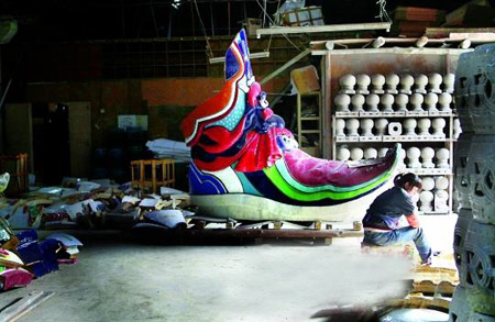 至昨日,“虎頭鞋”已做好,工人正將拼接成“繡花褲”的三百多塊陶片編號。雕塑主體為兩條扭在一起的腿,一條代表西方文化,穿黑色西褲和皮鞋,用不銹鋼做成;另一條穿繡花褲和虎頭鞋,由中國傳統的陶藝做成,寓意中西方文化交流。石灣陶藝家劉國華、劉國祥等人負責制作。