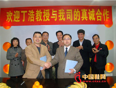 幫登鞋業總經理侯景國(前左)與中國地質大學(北京)教授、博士生導師丁浩(前右)簽定合作協議