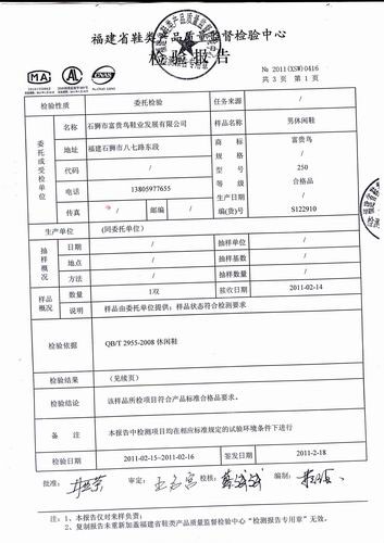 另一份報告則是2011年2月18日簽發的福建省鞋類產品質量監督檢驗中心對富貴鳥男休閑鞋所做的檢驗報告。報告中清楚地顯示,富貴鳥男休閑鞋的耐折性能、耐磨性能、剝離強度等檢測項目均符合質量標準。
