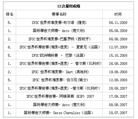 頻繁參加世界各大攀巖賽事的Julian近年來一直保持良好的競技狀態,成績不俗,如下所示其近年12次最好成績。
