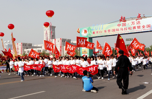 據(jù)悉,黃河口(東營)國際馬拉松賽已成功舉辦三屆,通過不斷提升的競賽水平、廣泛的群眾參與基礎和豐富的配套活法,逐步成為中國最具影響力的馬拉松賽事之一,并于2011年升級成為全國五大馬拉松積分賽之一。賽事的舉辦地東營是一座美麗的海濱城市,萬里黃河入海的地方。東營市政府將綠色觀念引入了城市馬拉松賽事,打造自然、健康馬拉松賽事,讓參賽選手與“綠色”一同奔跑。來自64個國家和地區(qū)的近20000名運動員共同參加了本次比賽。