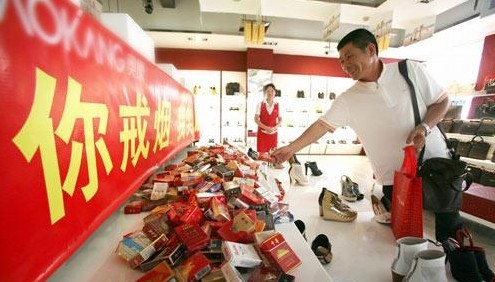 【中國鞋網-品牌動態】5月31日下午3點,五馬街奧康精品店,一市民拎著導購員贈送的奧康皮具一邊把身上所攜帶的香煙投到店內的香煙收集區。