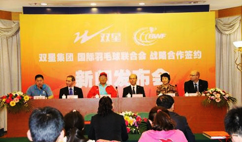 簽約儀式由雙星集團副總經理生錫順主持并做新聞發(fā)布,國際羽毛球聯(lián)合會派山副主席與雙星名人體育用品有限公司總經理于群力簽定了戰(zhàn)略合作協(xié)議。雙星與國際羽毛球聯(lián)合會達成為國際羽聯(lián)的技術官員、裁判員、工作人員提供雙星系列產品等多項內容。