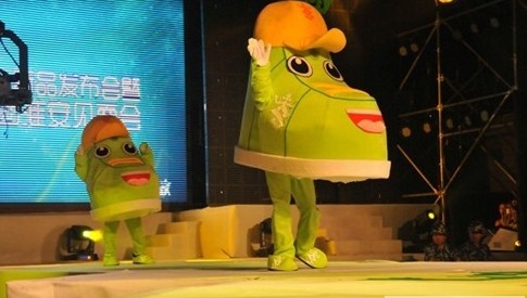 一對咧嘴開懷的吉祥物鞋寶貝在一場熱辣的開場舞后首次亮相,它們揮著手蹦蹦跳跳地上場與現場數千名熱情的觀眾見面,看它們那夸張的運動帽,前沿調皮地上翹;紅紅的嘴唇,時刻準備親親寶貝;天真的雙眼,滴妞妞瞪得大大的;青春的綠色皮膚覆蓋著身子,居然下面還生出兩條能運動的腿,還真是名副其實的“板鞋”啊。