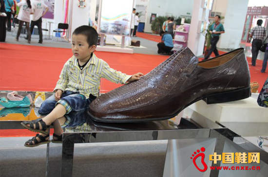 一個小朋友被亨達展區(qū)的巨鞋吸引,來和巨鞋合個影