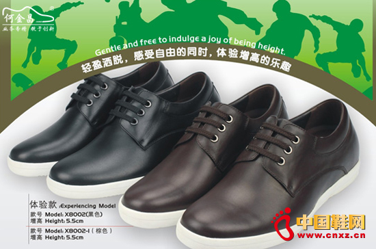 “” 內(nèi)增高鞋的出現(xiàn),點亮了所有想增高人的夢想,因為它采用的是物理增高原理,隱形的內(nèi)增高設(shè)計,外觀不露增高痕跡,有立增高的效果,產(chǎn)品增高高度5.5CM-13CM不等,風格多樣可分為西裝、商務(wù)休閑、運動鞋、板鞋、男靴、涼鞋、特高七大系列,何金昌產(chǎn)品用料采用上等材質(zhì),精雕細琢,道道工序精益求精,傾心打造內(nèi)增高鞋的經(jīng)典之作。“何金昌”倡導(dǎo)的是一種由外而內(nèi)的美,是漫漫人生路上自信從容的風度,是舉手投足之間優(yōu)雅成熟的氣質(zhì)。它代表的是男士對自信的追逐,對精神世界的探索,對豐神俊朗的向往,它不僅改變了外在的視覺形象,更塑造了堅實的內(nèi)心世界。更可貴的是“何金昌”不只是身材矮小者的專利,只要你對自己身材不滿意,你都可以擁有——何金昌。