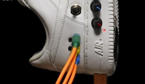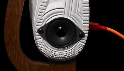 喜歡NIKE球鞋的朋友都知道這雙鞋,經典板鞋空軍一號,它被掛在了架子上,成了一對音箱。這是球鞋設計師Nash Money自己動手制作的一對電腦音箱,將鞋底掏空,把音箱功放,單元等都一并安置在空軍一號中,然后掛在兩個支架上,這個想法實在是酷。