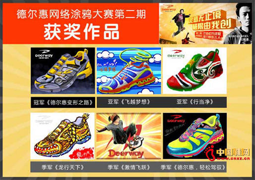 【中國鞋網-品牌動態】網絡涂鴉大賽第二期活動結果日前火熱出爐,大量優秀涂鴉作品爭奇斗艷,激烈角逐,令活動分外精彩。《德爾惠變形之路》、《行當凈》、《飛越夢想》、《龍行天下》等六幅涂鴉作品,以獨到的創意設計元素、頗具視覺沖擊的配色方案及深厚的作圖功底,贏得一致贊賞,榮膺德爾惠網絡涂鴉大賽第二期冠亞季軍。