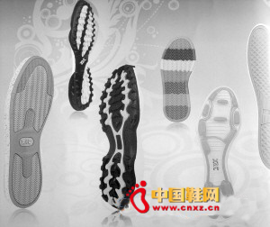 如果換成是跑鞋,鑫泰又會采用不同的材質組合開發符合該項運動的功能鞋底,舉個例子,跑鞋大多使用加碳橡膠,而且在跑鞋鞋底的后掌部分都會留有BRS的字母標示,在普通的橡膠材料里加入了碳元素,使得橡膠更加的堅韌耐磨。