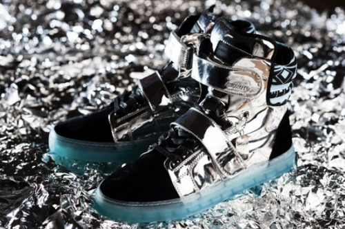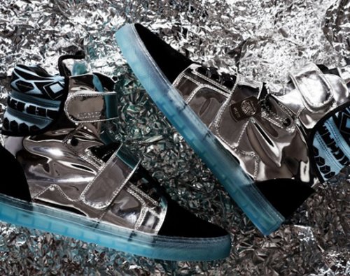 鞋面是由帶有金屬反光感的銀色皮革制成,鞋頭和鞋跟則選擇了黑色的翻毛皮作為映襯,既顯又具科幻感。最為亮眼的要數透明的天藍色鞋底,這種鞋底我們并不陌生,Nike的Air Force 1 就曾出過類似此鞋底的鞋款。Propulsion Hi運動鞋有藍色和紅色兩款顏色,每款限量發行72雙,而每雙都會有一塊金屬牌,上面印有其出廠編號。