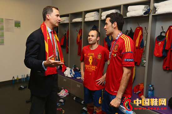 【中國(guó)鞋網(wǎng)-品牌動(dòng)態(tài)】歐洲杯大幕落下,伴隨著歐洲杯決賽史上最為懸殊的4-0,衛(wèi)冕冠軍西班牙成為歷史上第一支成功衛(wèi)冕歐洲杯的球隊(duì),同時(shí)也是歷史上第一支連續(xù)獲得歐洲杯、世界杯和歐洲杯冠軍的球隊(duì)。而在賽后第一時(shí)間,作為西班牙國(guó)家隊(duì)官方贊助商,也在斗牛士軍團(tuán)奪冠之后發(fā)布了暗紅色與金黃色搭配的奪冠紀(jì)念T恤,身為本屆賽事MVP得主的伊涅斯塔早已在決賽之后的更衣室內(nèi)擁有了屬于自己的奪冠紀(jì)念。(中國(guó)鞋網(wǎng)-最權(quán)威最專業(yè)的鞋業(yè)資訊中心)