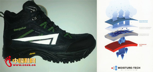 【中國鞋網-品牌動態】國內第一雙使用STX Moisture-Tech單導向除濕科技的產品由著名戶外品牌ONE POLAR設計完成。獨創單導向除濕層使汗汽持續性的向鞋外運動,使雙腳運動時產生的汗汽迅速排出鞋外。測試表明,汗水接觸到Moisture-Tech內里,不到2秒鐘就會被吸附導出,使鞋內環境長期保持健康,干爽環境。經過油蠟浸泡處理的napa牛皮配合SympaTex防水襪套,真正保證鞋子完全防水,并且超強透氣。來自意大利的VIBRAM鞋底采用3層結構,減緩戶外環境對足部的沖擊,保護膝蓋,耐磨防滑的鞋底花紋幫助使用者穿越各種復雜地貌環境。